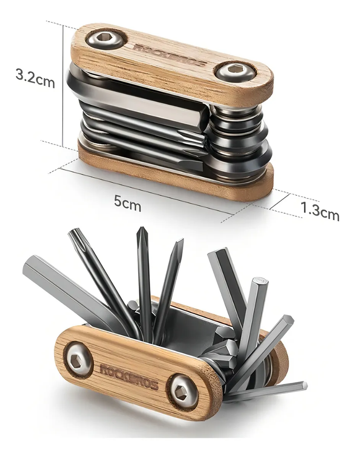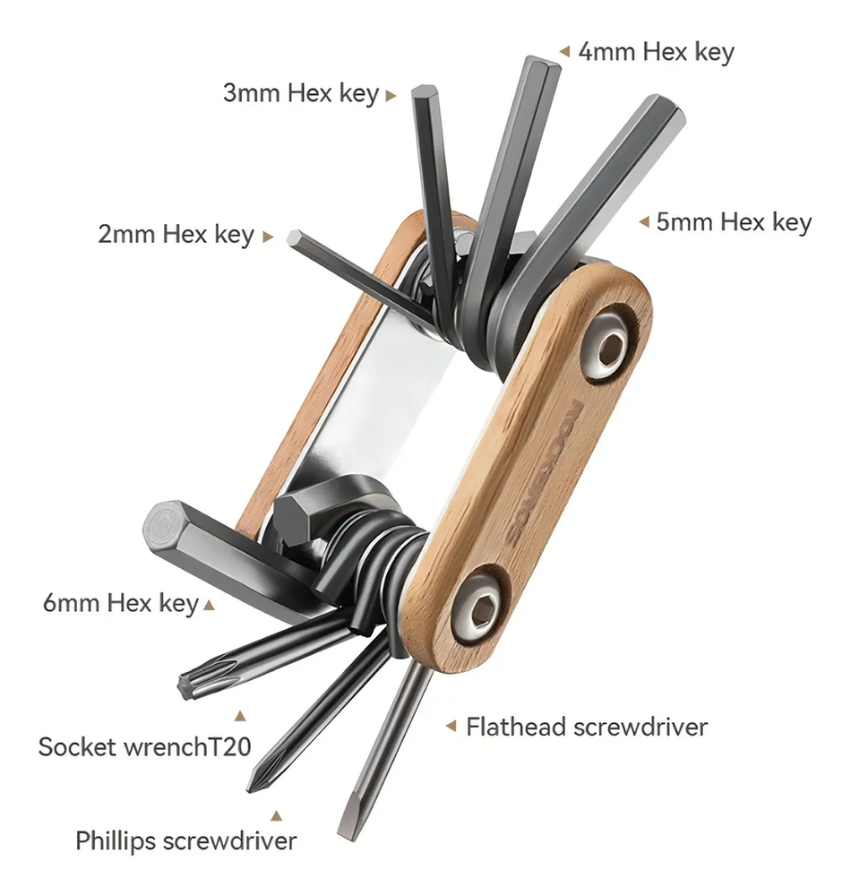 MULTIHERRAMIENTA DE 8 FUNCIONES Este kit de reparación para bicicleta contiene una amplia gama de herramientas esenciales, que incluyen cinco llaves hexagonales (2/3/4/5/6 mm), una llave de punta (T20), un destornillador Phillips y un destornillador plano para trabajos de reparación urgentes. Estas herramientas están diseñadas para brindar a los usuarios la capacidad de resolver una variedad de problemas de reparación de emergencia. El kit de reparación está hecho de acero de aleación 45CR resistente al desgaste con una superficie recubierta de titanio para una larga vida útil. La herramienta es plegable y ligera (hasta 80 g). La herramienta multifunción tiene un mango de madera maciza, agarre cómodo, y los tornillos laterales se pueden ajustar según sea necesario para aflojar la herramienta.